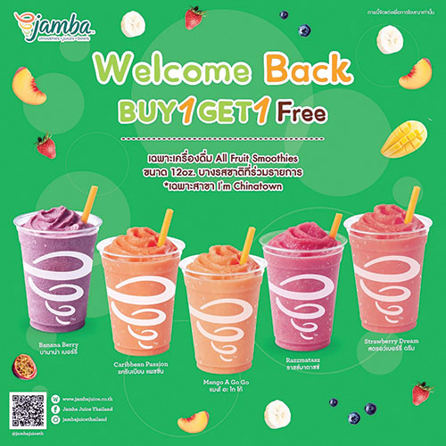ชวนชิมน้ำผลไม้พร้อมรับโปรโมชั่นพิเศษแบบแพ็กคู่เมื่อสั่งซื้อเครื่องดื่มหมวด All Fruit Smoothies 1 แก้ว รับอีก 1 แก้วฟรี ในราคา 115 บาท ถึง 28 ก.พ.ที่ ร้านแจมบาร์จูซ สาขา I’m China Town