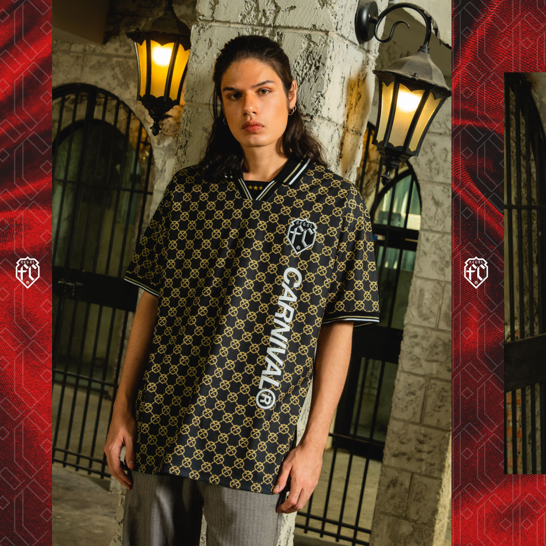 Carnival เสื้อบอลคอปก ปักสัญลักษณ์ REGAL F.C. สีทอง ตัวเสื้อพิมพ์ลายแพทเทิร์น Luckenbooth อันเป็นเอกลักษณ์ของชีวาส ที่ลุคดูเรียบหรูแต่ดูสปอร์ตในเวลาเดียวกัน
