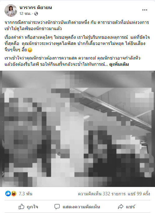 เราเข้าใจว่าคุณนักข่าวต้องการความสด ความreal คุณนักข่าวอาจกำลังหิว แล้วยังต้องรีบไลฟ์ รอให้กินเสร็จกลัวจะช้าไม่ทันการ คุณจะไลฟ์ไปกินไปก็เป็นสิทธิของคุณ แต่ขอเถอะ เวลาอาหารอยู่ในปาก กรุณาเคี้ยวให้หมดและกลืนลงคอ แล้วค่อยพูด ขอแค่นี้เอง นะจ๊ะ ปล.ขออภัยที่ต้องเบลอภาพจนดูไม่รู้เรื่อง เพราะคุณนักข่าวเค้าขู่จะฟ้องทุกกรณีที่มีการกล่าวถึง”