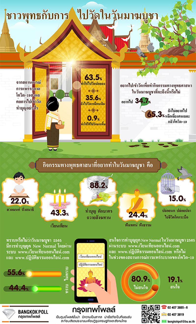 กรุงเทพโพลล์โดยมหาวิทยาลัยกรุงเทพสำรวจความคิดเห็นประชาชนเรื่อง “ชาวพุทธกับการไปวัดในวันมาฆบูชา” โดยเก็บข้อมูลจากประชาชนทั่วประเทศ จำนวน 1,142 คน พบว่า ชาวพุทธส่วนใหญ่ร้อยละ 63.5 เห็นว่าจากสถานการณ์การแพร่ระบาดโควิด-19 ทำให้ไปเข้าวัดทำบุญน้อยลง ขณะที่ร้อยละ 35.6 ยังไปเหมือนเดิม และร้อยละ 0.9 ทำให้ไปมากขึ้น