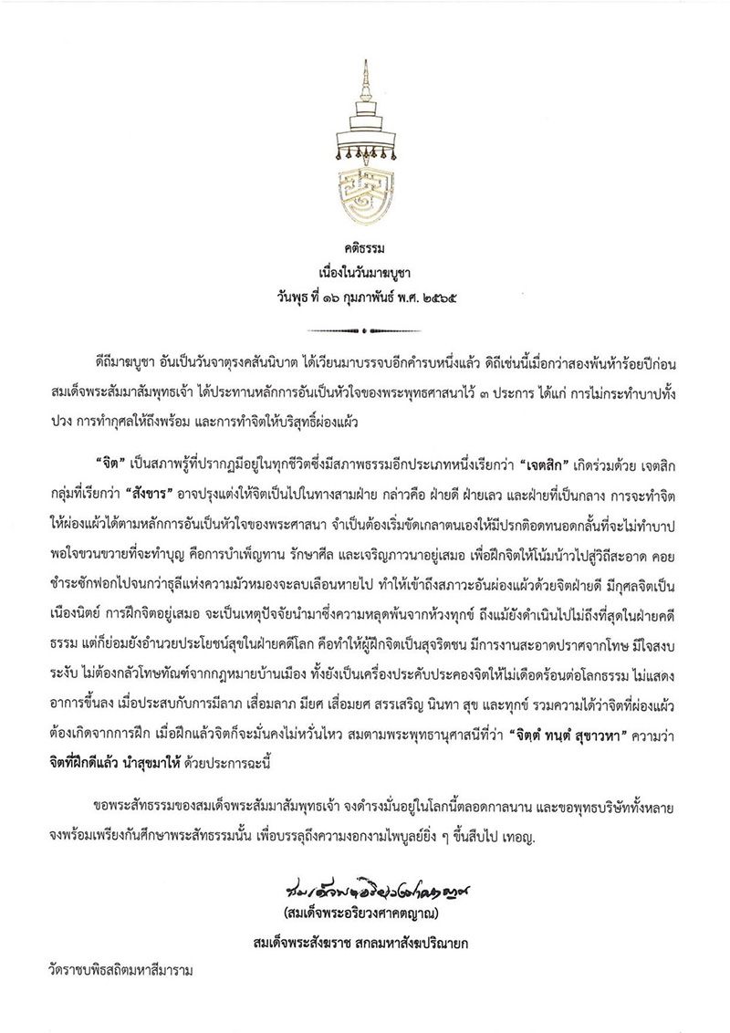 วันที่ 15 กุมภาพันธ์ 2565 เนื่องในวันมาฆบูชา 16 กุมภาพันธ์ 2565 เจ้าพระคุณ สมเด็จพระอริยวงศาคตญาณ สมเด็จพระสังฆราช สกลมหาสังฆปริณายก ประทานพระคติธรรม ความว่า
