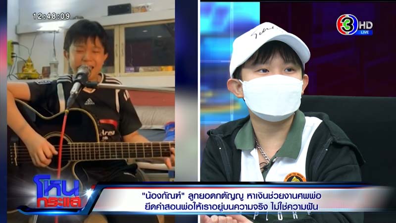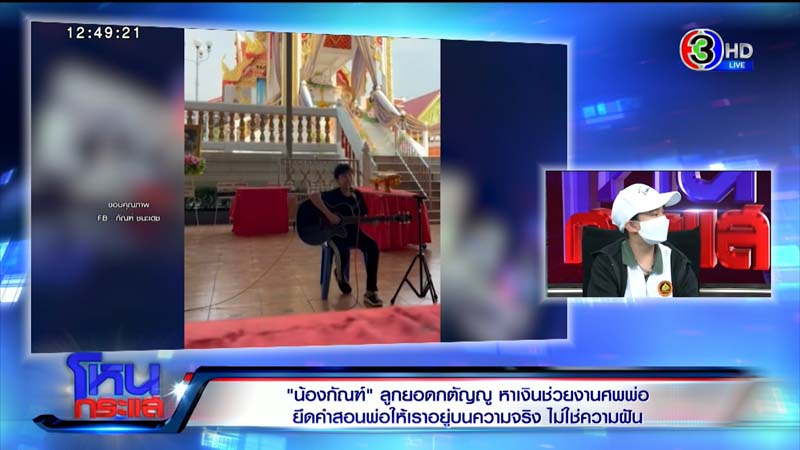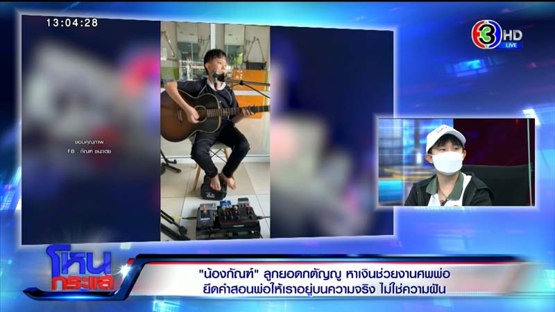 กัณฑ์ : ตอนนั้นเผาแล้วครับ แต่ที่กัณฑ์มาไลฟ์ เพราะพี่ก็เงินเหลือน้อยแล้ว พี่เขาไม่ได้ทำงาน พี่สาวคนนี้ที่ขายผัก เงินก็ลดลง กัณฑ์ก็อยากทำให้พ่อ เพราะพ่อเขาชอบเสียงกีต้าร์จากกัณฑ์ ก็เลยมาไลฟ์สดครับ