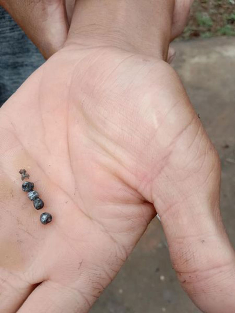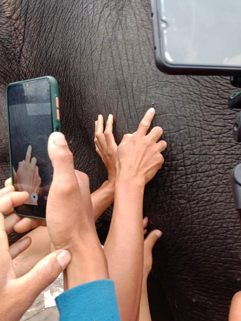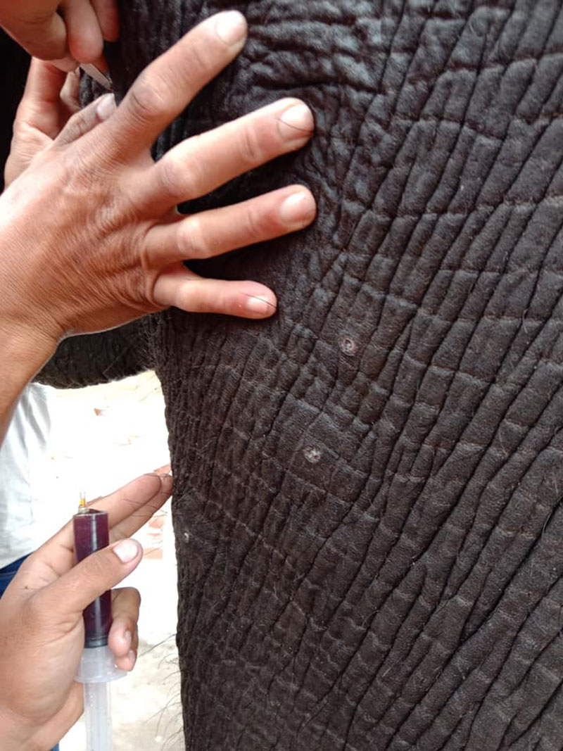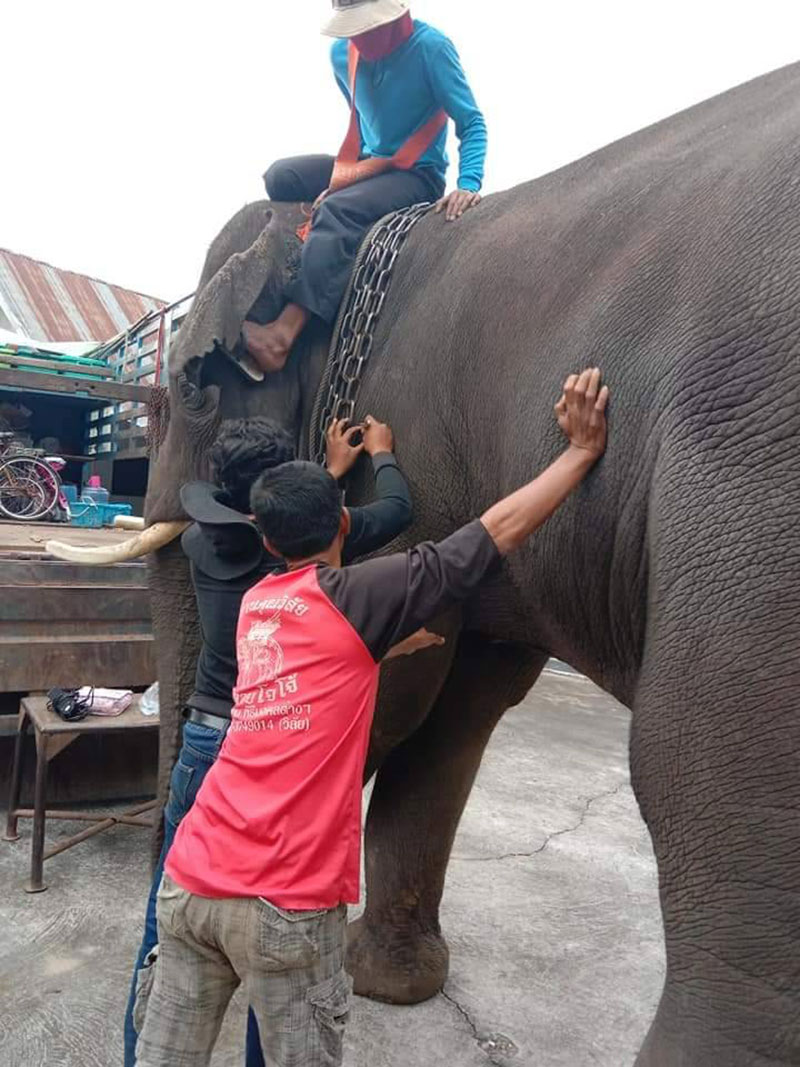 พอใกล้สว่างได้ยินเสียงปืนหลายนัดก็ไม่ได้คิดอะไร และควาญช้างเดินเข้าไปยังจุดที่พักช้าง เห็นวัยรุ่นขับขี่รถจักรยานยนต์มา 2 คัน 4 คน สวนออกไป ช่วงนั้นมืดจึงไม่เห็นว่ารถยี่ห้อ สี และไม่ทราบว่าช้างถูกยิง จนมาวันที่ 16 ก.พ.65 พบเห็นอาการบวมที่ขา จึงตรวจเช็ดโดยละเอียดพบโดนลูกปืน เป็นปืนชนิดลูกซอง เบอร์ 10 จึงใช้เวชภัณฑ์ของมูลนิธิช้างจัดการผ่าออก ที่บริเวณหน้าผาก 2 เม็ด ขาหน้าซ้าย 7 เม็ด หน้าท้อง 1 นัด แผลลึกกว่า 1 ซม.