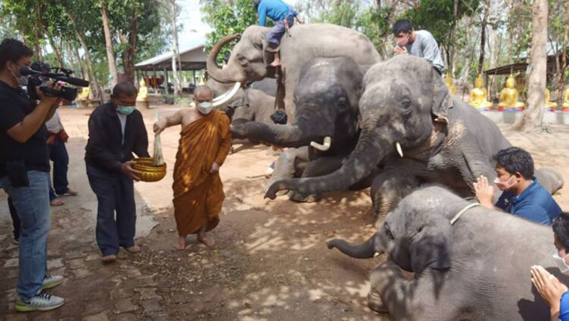 แต่ก่อนที่จะเดินทาง ได้นำช้างทั้งหมด 6 เชือก ไปให้ พระครูบุญจันทร์ กตสาโร เจ้าอาวาสวัดประชาพัฒนา ปะพรมน้ำพระพุทธมนต์เพื่อความเป็นสิริมงคลแก่ช้างและคณะคาราวาน ที่มีทั้งหมดกว่า 30 ชีวิต รถบรรทุก 3 คัน โดย นายก อบจ.สกลนคร มอบเงินเป็นกองทุนเพื่อเป็นกำลังใจให้คาราวานช้างวัฒนธรรม ที่มาช่วยงานตลอด จำนวน 5,000 บาท