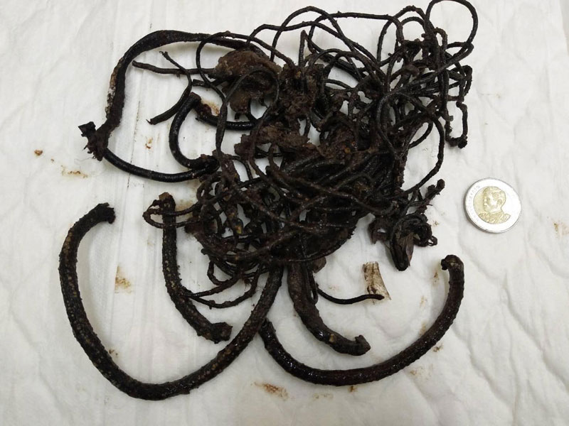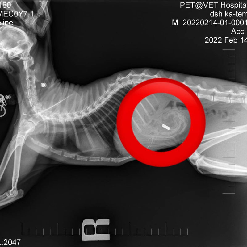 โดยระบุข้อความว่า “อุทาหรณ์ แมวกินยางรัดผม เคสนี้เจ้าของน้องสังเกตเห็นว่าน้องผอมลงมาก พยายามอ้วกแต่ไม่มีอะไรออกมา บางทีก็มีเลือดออก ไม่อึ พาไปตรวจเลือดก็ปกติดี จึงพาไปเอกซเรย์ เจอสิ่งแปลกปลอม ผ่าตัดออกมาเป็นยางรัดผมก้อนใหญ่มากกกก (เทียบกับเหรียญสิบข้าง ๆ)