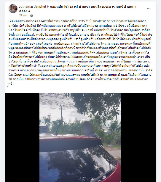 เตือนภัย… สำหรับใครที่โดยสารรถโดยสารต่างๆ เมื่อเฟซบุ๊ก “Juthamas Janphet” โพสต์คลิปพร้อมข้อความระบุว่า “เตือนภัยสำหรับชาวคลอง4ที่ใช้บริการแกร๊ปคาร์เป็นประจำ วันนี้เวลาประมาณ15:19 นาที เราได้เรียกรถจากแกร๊ปคาร์เพื่อไปยังอู่ บีทีพลัสคลองหลวง เราก็ได้นั่งรถไปถึงคลองสามคนขับถามว่าใช่ซอยนี้หรือเปล่าเราบอกไม่แน่ใจค่ะพี่ พี่ลองขับไปตามหมุดนะคร๊า หนูไม่ใช่คนแถวนี้ แต่คนขับขับไปด้วยอารมณ์ฉุนเฉียวเราก็ยังไงตั้งแต่ตอนนั้นแล้ว คนขับไปจอดส่งให้เราที่วัดแล้วบอกเราว่าถึงแล้ว เราก็ตอบไปว่าพี่ไม่ใช่นะค่ะที่นี้ไม่น่าใช่ คนขับตอบมาว่าเนี้ยอ่ะค่ะตามหมุดลองดูหน้าแอ๊ป เราก็ดูหน้าแอ๊ปแล้วตอบกลับไปว่าพี่ค่ะแต่หน้าแอ๊ปหนูรถพี่กับหมุดที่หนูปักอยู่คนละที่เลยค่ะ คนขับตอบมาว่าแล้วจะให้ไปส่งตรงไหน เราตอบว่าตรงหมุดที่หนูปักเลยพี่หนูจะลงตรงนั้นเราไปกับกันน 2 คน มีเด็กเล็กอีกคนนึงเราก็ว่าถ้าลงตรงที่วัดตรงนั้นที่เค้าจอดไห้แล้วจะไปต่อยังไง เราเลยบอกว่าพี่ไปส่งตามหมุดที่หนูปักนะคะ