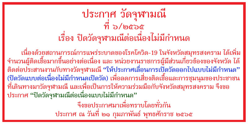เมื่อเวลา 22.00 น.ของวันที่ 21 กุมภาพันธ์ 2565 “วัดจุฬามณี” อ.อัมพวา จ.สมุทรสงคราม ออกประกาศ ฉบับที่ 6 เรื่อง “ปิดวัดจุฬามณีต่อเนื่องไม่มีกำหนด” ระบุว่า เนื่องด้วยสถานการณ์การแพร่ระบาดของโรคโควิด-19 ในจังหวัดสมุทรสงคราม ได้เพิ่มจำนวนผู้ติดเชื้อมากขึ้นอย่างต่อเนื่อง และ หน่วยงานราชการผู้มีส่วนเกี่ยวข้องของจังหวัด ได้ติดต่อประสานงานกับทางวัดจุฬามณี “ให้ประกาศเลื่อนการเปิดวัดออกไปแบบไม่มีกำหนด” (ปิดวัดแบบต่อเนื่องไม่มีกำหนดเปิดวัด) เพื่อลดการเสี่ยงติดเชื้อและการชุมนุมของประชาชนที่เดินทางมาวัดจุฬามณี และเพื่อเป็นการให้ความร่วมมือกับจังหวัดสมุทรสงคราม จึงขอประกาศ “ปิดวัดจุฬามณีต่อเนื่องแบบไม่มีกำหนด”