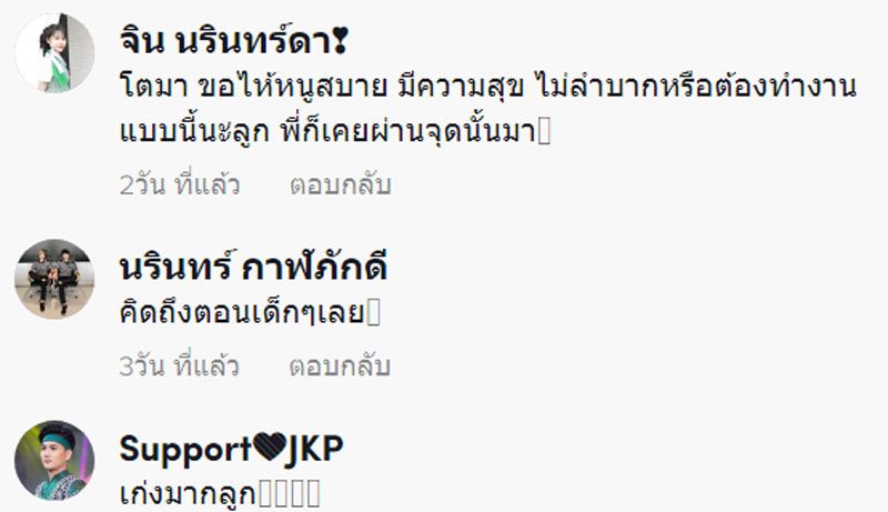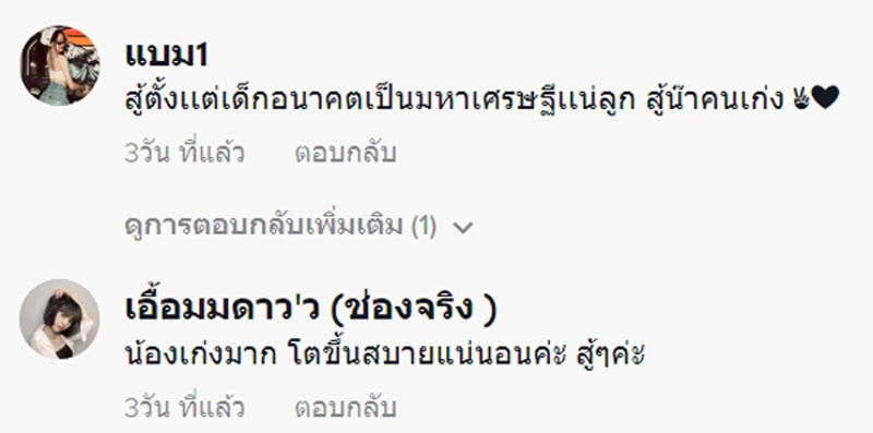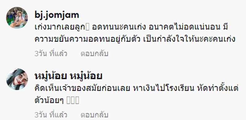 บักหล่าคือเก่งแท้ลูก , สู้ตั้งเเต่เด็ก อนาคตเป็นมหาเศรษฐีเเน่ลูก สู้น้าคนเก่ง , น้องเก่งมาก โตขึ้นสบายแน่นอนค่ะ สู้ๆค่ะ , เห็นตัวเองเมื่อตอนเด็กๆ ตัดอ้อยหาเงินไปโรงเรียน น้องเก่งหลายจ้า , เก่งมากเลยลูกอดทนนะคนเก่ง อนาคตไม่อดแน่นอน มีความขยันความอดทนอยู่กับตัว เป็นกำลังใจให้นะคะคนเก่ง , วันนี้เจ้าลำบาก วันข้างหน้าเจ้าจะเป็นคนที่แข็งแกร่งที่สุดหล่าเอ้ย