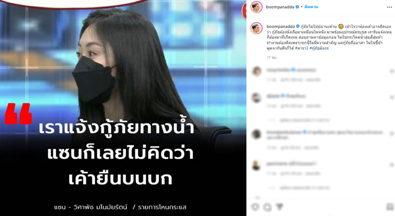 ล่าสุด “บุ๋ม ปนัดดา” ได้โพสต์ผ่านอินสตราแกรมของเธอหลังได้ฟังคำสัมภาษณ์ของแซน โดยระบุข้อความว่า “กู้ภัยไม่ใช่ปลานะค้าบ เข้าใจว่าน้องเค้าอาจคิดเองว่า กู้ภัยต้องนั่งเรือมาเหมือนในหนัง มาพร้อมอุปกรณ์ครบชุด เรารับแจ้งเหตุก็ต้องมาที่เกิดเหตุ สอบถามหาข้อมูลก่อน ไม่ใช่กระโดดน้ำสุ่มสี่สุ่มห้า ทำงานต้องคิดเพราะทุกชีวิตมีความสำคัญ แต่กู้ภัยคืออาสา ไม่ใช่ขี้ข้า พูดจากันดีๆก็ได้ #ดารา3 #กู้ภัยมังกร”. -008