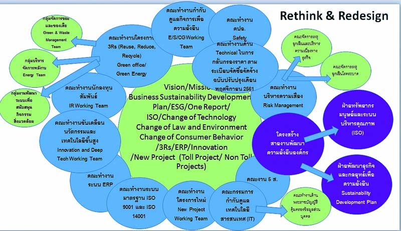 นอกจากนี้ยังมีการแต่งตั้งคณะทำงานชุดหลักและชุดย่อยต่างๆ เป็นการรวมกันของบุคลากรหลากหลายหน่วยงานภายในองค์กรที่ประกอบไปด้วยสมาชิกมากกว่า 1 ฝ่าย เพื่อร่วมกันทำงาน (Matrix management) เพื่อลดขั้นตอนการประสานงานให้สั้นลง ทำให้รวดเร็วและมีประสิทธิภาพมากขึ้น สนับสนุนความยั่งยืนใน 3 มิติ สิ่งแวดล้อม สังคม และกำกับดูแลกิจการ สรุปคณะทำงานและขอบเขตความรับผิดชอบ โดยผลลัพธ์และเป้าหมายที่บริษัทตั้งไว้ในแผนธุรกิจเพื่อความยั่งยืนนั้น จะครอบคลุมทั้งมิติสังคม สิ่งแวดล้อม และการกำกับดูแลกิจการ (ESG) แบ่งออกเป็นดังนี้ มิติสิ่งแวดล้อม (Environment) บริษัทฯ จะดำเนินธุรกิจควบคู่ไปกับการอนุรักษ์ เพื่อขับเคลื่อนการช่วยลดโลกร้อน และป้องกันการเปลี่ยนแปลงสภาวะภูมิอากาศ (Climate Change) เช่น การป้องกันมลพิษ การลดก๊าชเรือนกระจก และการใช้ทรัพยากรอย่างคุ้มค่า มิติสังคม (Social) บริษัทฯ จะดำเนินธุรกิจควบคู่ไปกับการให้บริการที่เป็นเลิศ (Service Quality) การอำนวยความสะดวก รวดเร็วและปลอดภัยรวมไปถึงเรื่องสิทธิมนุษยชนและความเท่าเทียม และการพัฒนานวัตกรรมการให้บริการที่คำนึงถึงความต้องการของผู้ใช้บริการ การกำกับดูแลกิจการ (Governance) หรือมิติเศรษฐกิจ (Economic) บริษัทฯ จะกำกับดูแลกิจการให้มีผลตอบแทนที่มั่นคง มีความโปร่งใส มีกลไกการตรวจสอบหรือถ่วงดุล ดำเนินการภายใต้กฎ ระเบียบและข้อบังคับต่างๆ อย่างเคร่งครัดและเตรียมพร้อมสำหรับการลงทุนในการขยายธุรกิจ เข้าร่วมประมูลในโครงการ PPP ภาครัฐ รวมไปถึงการสร้างบุคลากรที่มีประสิทธิภาพ