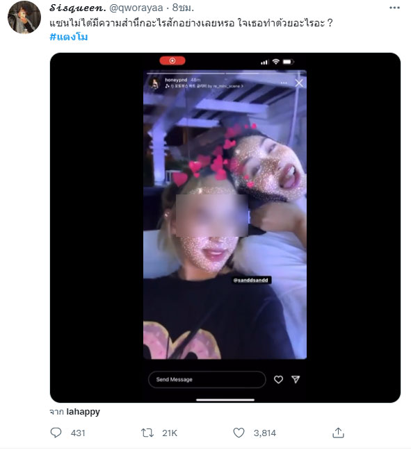 โดยชาวเน็ตเห็นแล้วต่างออกมาแสดงความคิดเห็นถึงความไม่เหมาะสมกับสถานการณ์เช่นนี้ รวมถึงใบหน้าของแซนที่ยังมีอารมณ์ยิ้มแย้มมีความสุข จึงทำให้ชาวเน็ตเหมารถทัวร์ไปกระหน่ำลงฝั่งเพื่อนของแซนด้วยเช่นกัน ถามหาถึง “ความเหมาะสมมีบ้างมั้ย” . -008