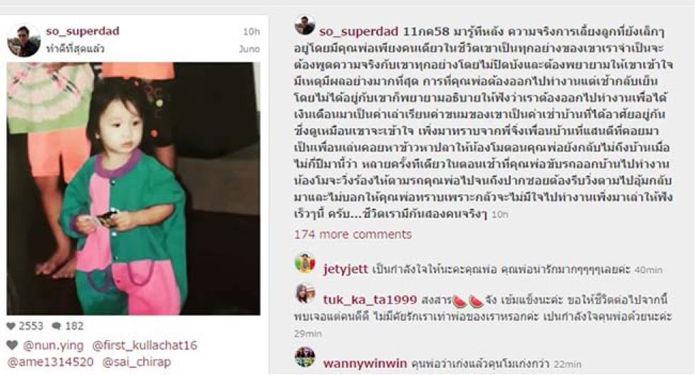 “ครอบครัวที่มีกันสองคน ที่บอกว่าครอบครัวเรามีกันเพียงสองคนเพราะได้หย่ากับคุณแม่เขาตั้งแต่น้องโมมีอายุประมาณสามขวบ หลังจากนั้นสองคนพ่อลูกก็ตระเวนอาศัยเช่าอพาร์ตเมนต์อยู่บ้าง เช่าทาวน์เฮาส์หลังรามอยู่บ้างตามประสาพ่อลูกลำพังสองคน ชีวิตที่ผ่านมา ทุลักทุเลพอสมควรด้วยคนเป็นพ่อต้องออกไปทำงานตามเวลาปกติกลับบ้านเย็นบ้างค่ำบ้างแล้วแต่งานในความรับผิดชอบจะแล้วเสร็จ ซึ่งแปลว่าระหว่างวันน้องโมต้องอยู่ให้ได้ด้วยตนเอง อาศัยเพื่อนบ้านมาเป็นเพื่อนบ้าง ไม่มีใครเป็นเพื่อนบ้าง ด้วยความรักที่มีให้แก่กันเกินร้อยเราก็ผ่านวันเวลาที่ยากลำบากเหล่านั้นมาได้ด้วยดีพอสมควร ด้วยสภาพข้อเท็จจริงดังกล่าวผมมีความสามารกเลี้ยงลูกได้ดีเพียงแค่นี้ครับที่เหลือเป็นพระพรจากพระเจ้าที่ให้น้องโมแข็งแกร่งและเป็นเด็กมีความคิดดีจึงมีวันนี้ ที่เป็นแตงโม ภัทรธิดาที่ท่านทั้งหลายได้รู้จัก ก็โตจากเด็กที่ไม่เคยได้รับการถักเปียไปโรงเรียนจากคุณพ่อเพราะพ่อถักไม่เป็นจนทุกวันนี้”