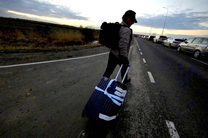 O ฌอน เพนน์ โพสต์ภาพถ่ายของเขาบนบัญชีทวิตเตอร์ส่วนตัว เป็นภาพเขาสวมหมวกแก๊ป สะพายเป้และอีกมือหนึ่งลากกระเป๋าเดินทางกำลังเดินไปตามไหล่ถนนที่มีรถยนต์ขับเรียงต่อกันเป็นแถวยาวเหยียด เพนน์ ทวีตข้อความใต้ภาพถ่ายระบุว่า เขาและเพื่อนอีก 2 คน เดินเป็นระยะทางหลายไมล์ไปยังพรมแดนยูเครนที่ติดกับโปแลนด์ หลังจากทิ้งรถไว้ริมถนน เขากล่าวด้วยว่า รถยนต์เกือบทั้งหมดที่เห็นในภาพมีแต่สตรีและเด็กเท่านั้นและไม่เห็นมีสิ่งของใดๆ ติดมาด้วย มีรายงานในเวลาต่อมาว่า เพนน์เดินทางออกจากยูเครนอย่างปลอดภัย แต่ยังไม่รู้ว่าตอนนี้เจ้าตัวอพยพไปอยู่ที่ไหน เพนน์ เดินทาง