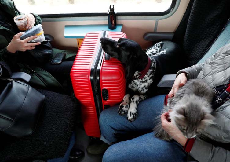 ไปด้วยกัน : สุนัขและแมวนั่งไปพร้อมกับเจ้าของที่อพยพจากยูเครน บนที่นั่งรถไฟโดยสารที่เตรียมเดินทางออกจากเมืองซาโฮนี ประเทศฮังการี ต่อไปยังกรุงบูดาเปสต์ ประเทศฮังการี