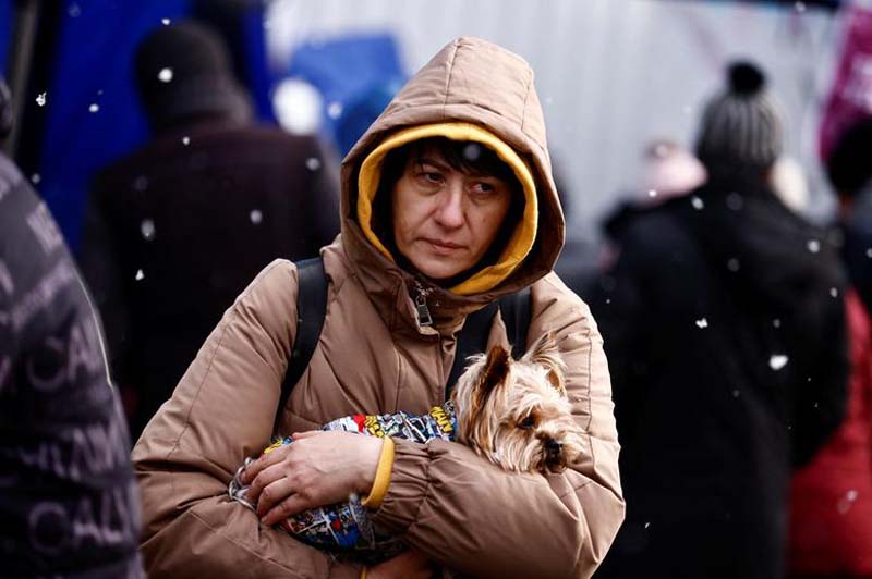 กอดไว้ : หญิงยูเครนประคองสุนัขตัวน้อยของเธอในอ้อมกอด ขณะยืนอยู่ด้านนอกศูนย์พักพิงชั่วคราว ในเมืองคอซโซวา ประเทศโปแลนด์ หลังหอบหิ้วกันหนีตายมาจากยูเครน ที่ตอนนี้กำลังถูกกองทัพรัสเซียบุกโจมตี