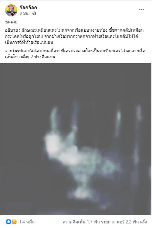 โดยเพจดังกล่าว ได้โพสต์ภาพพร้อมข้อความระบุว่า “ชัดเลย อธิบาย : ลักษณะเหมือนแตงโมตกจากเรือแบบหงายท้อง ซึ่งจากคลิปเหมือนกระโดด (หรือถูกโยน) จากข้างเรือมากกว่าตกจากท้ายเรือและในคลิปไม่ได้เป็นการฉี่ที่ท้ายเรือแน่นอน จากในรูปแตงโมใส่ชุดบอดี้สูท ที่เอวช่วงล่างก็จะเป็นชุดที่ผูกเอวไว้ ตกจากเรือ เส้นสีขาวตั้งๆ 2 ข้างคือแขน”. -008