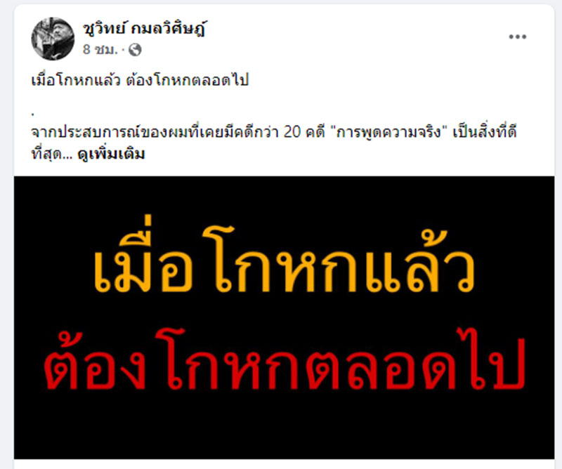 เมื่อวันที่ 7 มีนาคม 2565 นายชูวิทย์ กมลวิศิษฎ์ อดีตนักการเมืองและนักธุรกิจกลางคืนชื่อดัง เขียนบทความ “เมื่อโกหกแล้ว ต้องโกหกตลอดไป” เผยแพร่ผ่านเฟซบุ๊กส่วนตัว เนื้อหาดังนี้