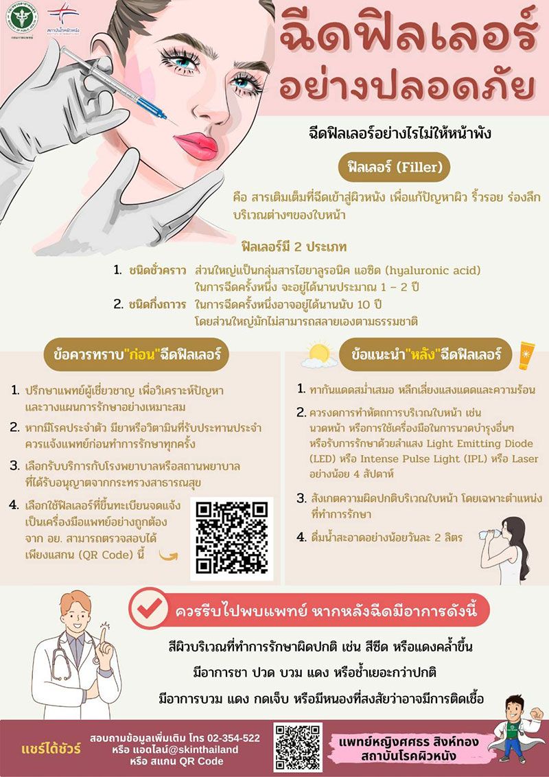 กรมการแพทย์ โดยสถาบันโรคผิวหนัง แนะนำการฉีดฟิลเลอร์(Filler) หรือการฉีดสารเติมเต็มเข้าสู่ผิวหนัง เพื่อช่วยแก้ไขปัญหาผิว ริ้วรอยร่องลึก บริเวณต่าง ๆ ของใบหน้านั้น ควรปรึกษาแพทย์เฉพาะทางด้านผิวหนังก่อนฉีด และปฏิบัติตามข้อแนะนำก่อนและหลังการฉีดฟิลเลอร์ เพื่อลดโอกาสเกิดความผิดปกติหรือการเกิดภาวะแทรกซ้อน