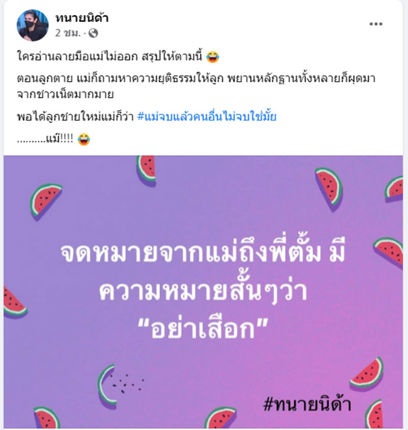 “จดหมายจากแม่ถึงพี่ตั้ม มีความหมายสั้นๆว่า “อย่าเสือก” ทนายนิด้า ระบุ พร้อมกับเข้าไปคอมเม้นต์เพิ่มเติมว่า ส่วนตัวขอยืนหยัดเสือกต่อไป แตงโมต้องไม่ตายโดยไม่รู้สาเหตุ #ใครไม่เสือกด้าเสือก โดยมีผู้เข้าไปแสดงความคิดเห็นถูกใจกับคำตอบนี้เป็นอย่างมาก