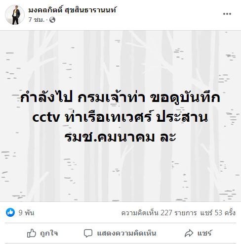 โดยระบุครั้งแรกว่า “กำลังไป กรมเจ้าท่า ขอดูบันทึก CCTV ท่าเรือเทเวศร์ ประสาน รมช.คมนาคม ละ”