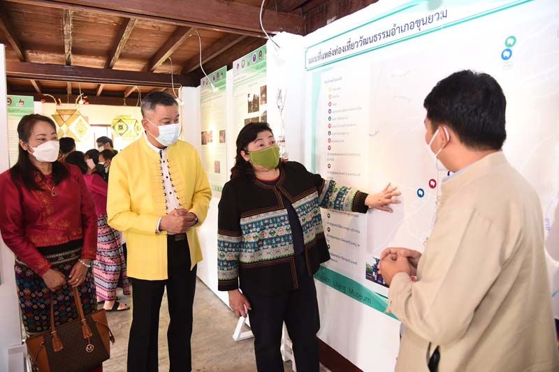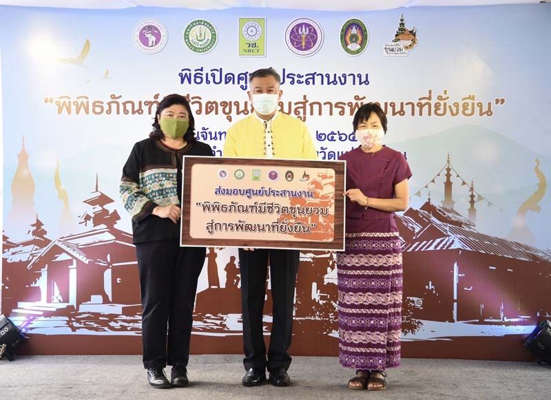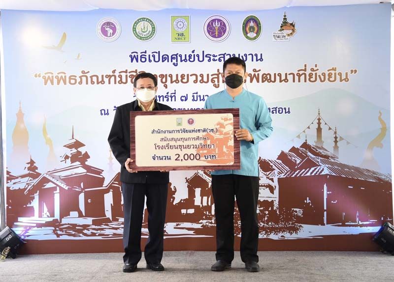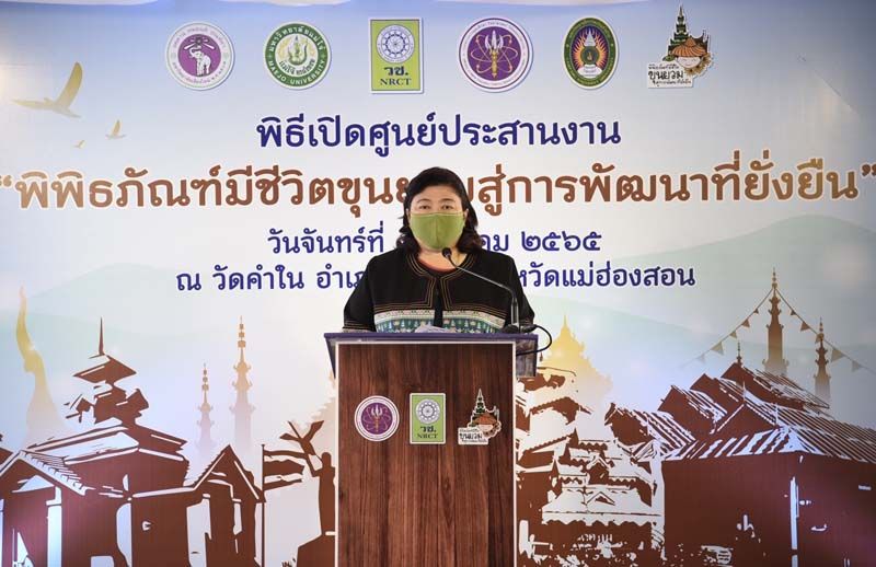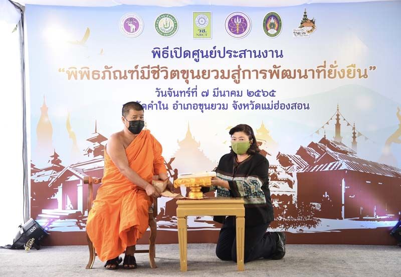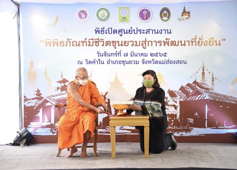 วันที่ 7 มีนาคม 2565 ดร.วิภารัตน์ ดีอ่อง ผู้อำนวยการสำนักงานการวิจัยแห่งชาติ เป็นประธาน เปิดศูนย์ประสานงาน“พิพิธภัณฑ์มีชีวิตขุนยวมสู่การพัฒนาที่ยั่งยืน” พร้อมด้วยผู้ทรงคุณวุฒิ วช. รองผู้ว่าราชการจังหวัดแม่ฮ่องสอน ผู้นำชุมชนท้องถิ่นในอำเภอขุนยวม เครือข่ายนักวิจัย มหาวิทยาลัยเชียงใหม่ มหาวิทยาลัยแม่โจ้ และมหาวิทยาลัยราชภัฏลำปาง ให้เกียรติเข้าร่วมในพิธีเปิดศูนย์ฯ ณ วัดคำใน อำเภอขุนยวม จังหวัดแม่ฮ่องสอน เพื่อนำองค์ความรู้จากการวิจัยมาบูรณาการกิจกรรมของพิพิธภัณฑ์มีชีวิตขุนยวม พร้อมส่งมอบบัญชีศิลปวัตถุแก่วัดม่วยต่อ และวัดคำใน เพื่อการอนุรักษ์เก็บรักษามรดกทางวัฒนธรรมของชาติต่อไป
