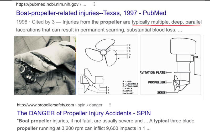 บาดแผลที่เกิดจากใบพัดเรือขณะกำลังหมุน จะมีลักษณะ ฉีกขาด (lacerations) หลายแผล (multiple) ลึก และ ขนานกัน (parallel)