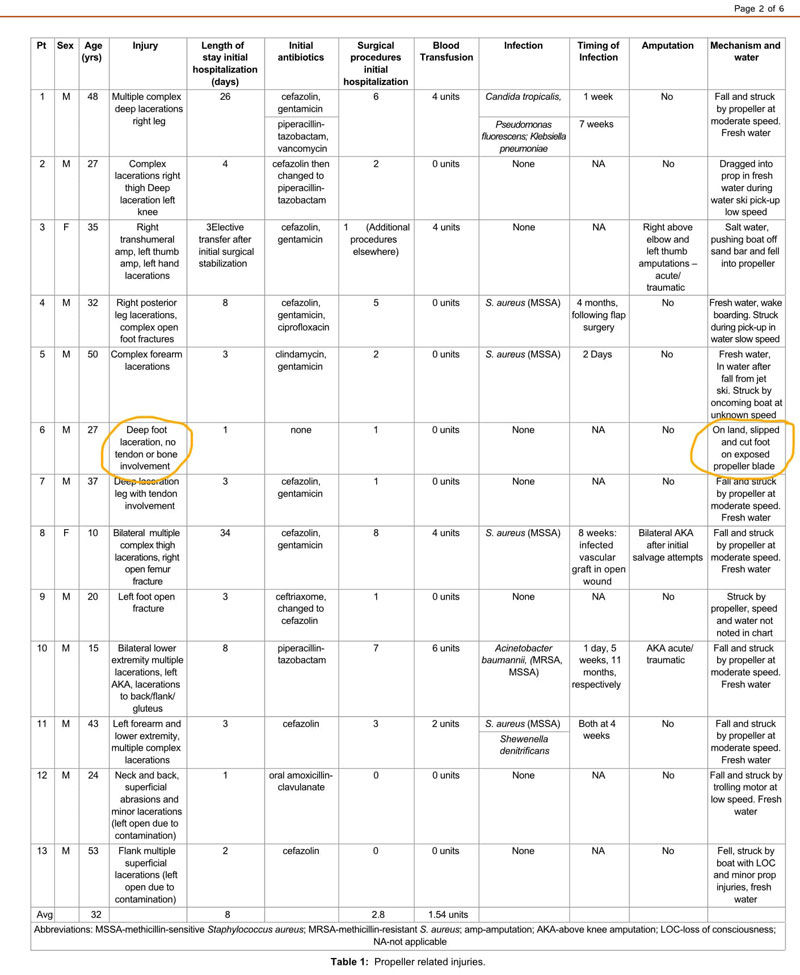 งานวิจัยจำนวนมาก บรรยายถึงบาดแผลจากใบพัดเรือในทำนองเดียวกัน น้อยมากที่จะเจอแผลเดียวไม่ลึก เห็นมีอยู่รายนึง (วงกลมสีเหลือง) เป็นแผลเดียวที่เท้า เอ็นไม่ขาด แต่รายนั้นก็เกิดจากลื่นแล้วไปสะดุดใบพัดเรือซึ่งจอดอยู่บนบก – 009