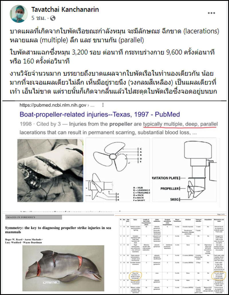 บาดแผลที่เกิดจากใบพัดเรือขณะกำลังหมุน จะมีลักษณะ ฉีกขาด (lacerations) หลายแผล (multiple) ลึก และ ขนานกัน (parallel)