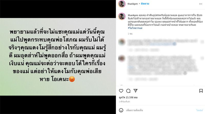 “คุณพ่อ ฝ่าฟันอุปสรรคกับน้องมาตลอด ดูแลอาหารการกิน ขับรถรับส่งไปเฝ้าตามกองถ่ายมาตลอด วันนี้ทั้งน้องและคุณพ่อจากไปแล้ว คุณแม่จะแดกดันคุณพ่อทำไม บ่องตง คณแม่ทำหน้าที่ได้แย่มาก ทั้งตอนที่น้องมีชีวิต และตอนที่น้องจากไปแล้ว ขอฟาดบ้างเหอะ ทนมาหลายวันละ #โมโหมากแม่”