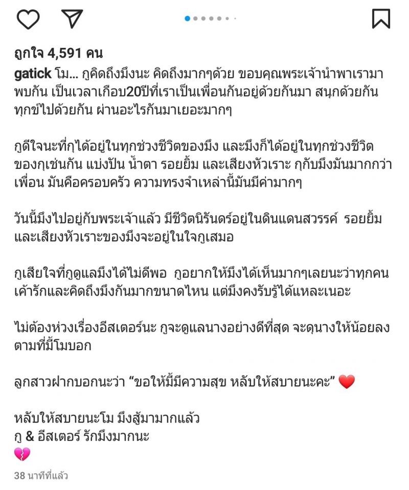 “โม… กูคิดถึงมึงนะ คิดถึงมาก ๆ ด้วย ขอบคุณพระเจ้านำพาเรามาพบกัน เป็นเวลาเกือบ 20 ปีที่เราเป็นเพื่อนกันอยู่ด้วยกันมา สนุกด้วยกัน ทุกข์ไปด้วยกัน ผ่านอะไรกันมาเยอะมาก ๆ