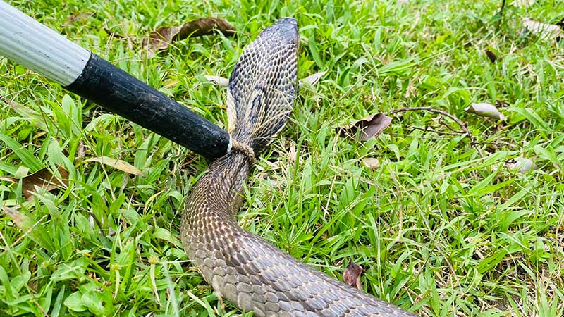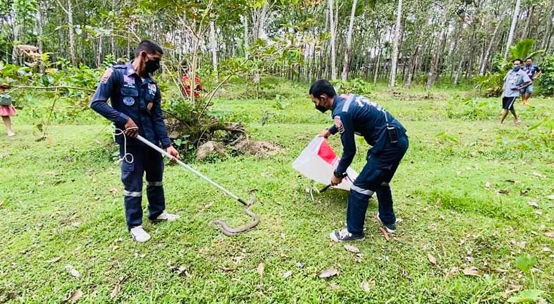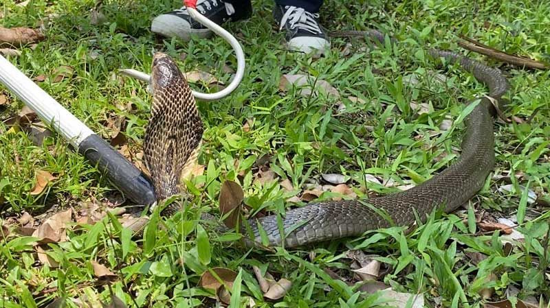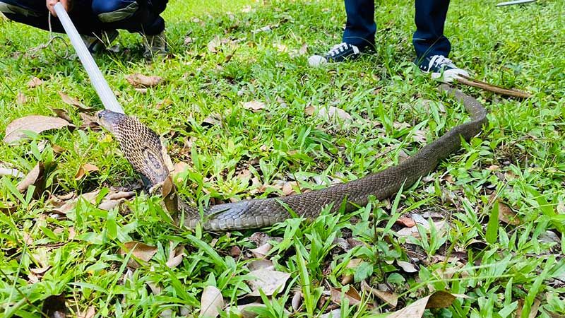 14 มีนาคม 2565 เจ้าหน้าที่กู้ภัยพัทลุงพร้อมอุปกรณ์จับสัตว์เลื้อยคลาน เข้าตรวจสอบในบ่อน้ำลึก 2 เมตร ข้างป่าสวนยางพารา ท้องที่ ม.3 ต.โคกชะงาย อ.เมือง จ.พัทลุง หลังได้รับแจ้งทางโทรศัพท์ว่า มีงูตัวใหญ่ชูคอแผ่แม่เบี้ยในบ่อน้ำ เมื่อไปถึงพบว่าปากบ่อถูกปิดไว้ ด้วยแผ่นไม้และมีก้อนหินวางทับอยู่ จึงค่อยๆเอาหินออกและเปิดแผ่นไม้ดูพบว่า มีงูเห่าตัวขนาดใหญ่ ชูคอแผ่แม่เบี้ยลอยน้ำอยู่ในบ่อ จึงรีบใช้บ่วงยื่นลงไปเพื่อจะคล้องหัวงู
