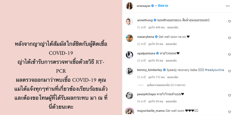 โดยระบุข้อความผ่านอินสตาแกรมว่า “หลังจากญาญ่าได้สัมผัสใกล้ชิดกับผู้ติดเชื้อ COVID-19 ญ่าได้เข้ารับการตรวจหาเชื้อด้วยวิธี RT-PCR ผลตรวจออกมาว่าพบเชื้อ COVID-19 คุณ แม่ได้แจ้งทุกๆ ท่านที่เกี่ยวข้องเรียบร้อยแล้ว และต้องขอโทษผู้ที่ได้รับผลกระทบ มา ณ ที่นี้ด้วยนะคะ”.