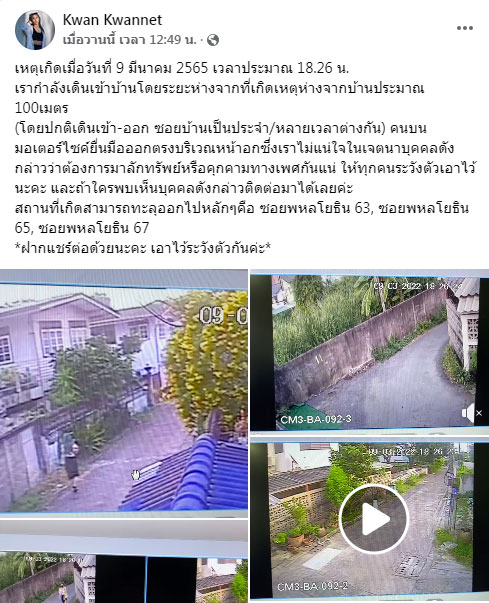 โดยข้อความระบุว่า “เหตุเกิดเมื่อวันที่ 9 มีนาคม 2565 เวลาประมาณ 18.26 น. เรากำลังเดินเข้าบ้านโดยระยะห่างจากที่เกิดเหตุห่างจากบ้านประมาณ 100เมตร (โดยปกติเดินเข้า-ออก ซอยบ้านเป็นประจำ/หลายเวลาต่างกัน) คนบนมอเตอร์ไซค์ยื่นมือออกตรงบริเวณหน้าอกซึ่งเราไม่แน่ใจในเจตนาบุคคลดังกล่าวว่าต้องการมาลักทรัพย์หรือคุกคามทางเพศกันแน่ ให้ทุกคนระวังตัวเอาไว้นะคะ และถ้าใครพบเห็นบุคคลดังกล่าวติดต่อมาได้เลยค่ะ สถานที่เกิดสามารถทะลุออกไปหลักๆคือ ซอยพหลโยธิน 63, ซอยพหลโยธิน 65, ซอยพหลโยธิน 67 *ฝากแชร์ต่อด้วยนะคะ เอาไว้ระวังตัวกันค่ะ*”.-008