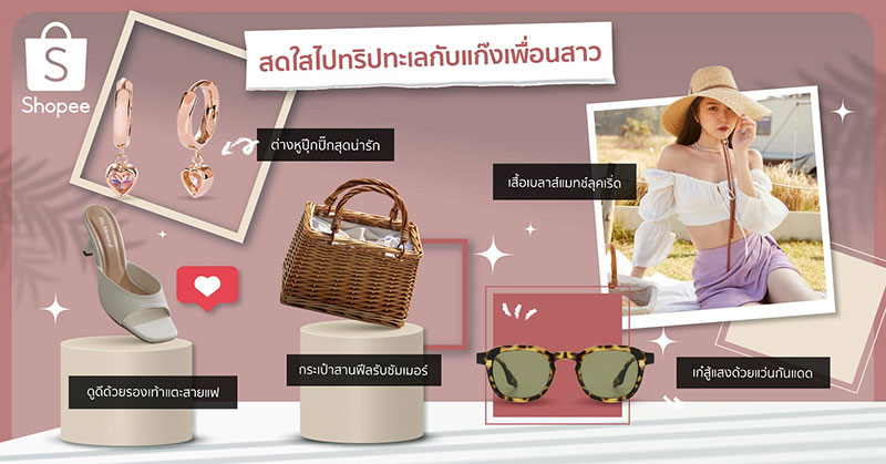 LOOK 2 : สดใสไปทริปทะเลกับแก๊งเพื่อนสาวซัมเมอร์นี้แน่นอนว่าหลายๆ คน คงเริ่มแพลนทริปท่องเที่ยวภายใต้ความปลอดภัยในสถานการณ์เช่นนี้ เรียกได้ว่า คุณสามารถเข้ามาท่องโลกแฟชั่นที่ครอบคลุมสินค้าทุกเซ็กเม้นต์ได้ในแคมเปญ Shopee’s Fashion Week ที่ช้อปปี้การันตีว่า ปังรับซัมเมอร์อย่างแน่นอน โดยเฉพาะลุคสดใสไปทริปทะเลกับแก๊งเพื่อนสาว ที่ทุกอย่างคุณสามารถช้อปได้ที่ช้อปปี้ เริ่มกันด้วยเสื้อเบลาท์สีครีมๆ เลือกแมทช์กับกางเกงขาสั้นสีพาสเทลก็สวยไปอีกแบบ คู่กับต่างหูเสริมลุคสวย พร้อมเก๋สู้แดดด้วยแว่นตากันแดดสุดเลิศ และดูดีด้วยรองเท้าแตะสายแฟแต่จะขาดกระเป๋าสานและหมวกปีกกว้างที่ถือเป็นMust-Have Items ที่สาวๆ ไม่ควรพลาดในซัมเมอร์นี้