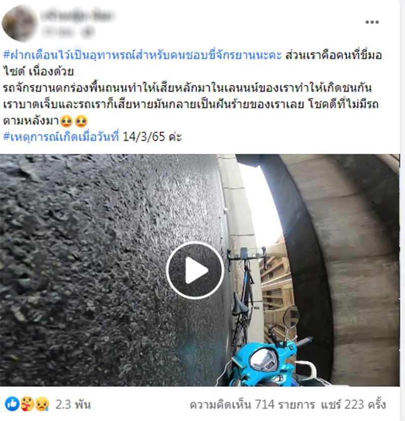 โดยผู้โพสต์ ระบุข้อความว่า ฝากเตือนไว้เป็นอุทาหรณ์สำหรับคนชอบขี่จักรยานนะคะ ส่วนเราคือคนที่ขี่มอเตอร์ไซค์ เนื่องด้วยรถจักรยานตกร่องพื้นถนนทำให้เสียหลักมาในเลนของเรา ทำให้เกิดชนกันเราบาดเจ็บและรถเราก็เสียหายมันกลายเป็นฝันร้ายของเราเลย โชคดีที่ไม่มีรถตามหลังมา เหตุการณ์เกิดเมื่อวันที่ 14/3/65 ค่ะ