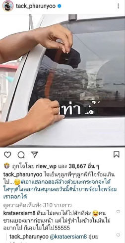 ล่าสุด นักแสดงหนุ่ม “แทค ภรัณยู” ก็ได้ออกมาเคลื่อนไหวด้วยการโพสต์อินสตาเเกรมระบุข้อความว่า “ใจเย็นๆ ลูกพี่ๆๆ ลูกพี่ก็ใจร้อนเกินไป #เอาแฮลกอฮอล์ล้างด้วยนะกระจกจะได้ใสๆๆ #ไงลอกกันสนุกเลยวันนี้ #น้ำยาพร้อมใจพร้อมเราลอกได้” ขณะที่ “กระแต อาร์สยาม” ได้เข้ามาเมนต์ ว่า “ดีนะที่ไม่เคยไปวัดนี้”
