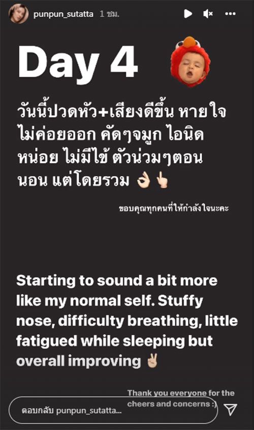 ล่าสุด ในวันนี้ได้มีการออกมาโพสต์ข้อความเพื่ออัปเดตอาการป่วยวันที่ ผ่านทางอินสตาแกรมสตอรี่ โดยเจ้าตัวได้เผยว่า Day 4 วันนี้ปวดหัว + เสียงดีขึ้น หายใจไม่ค่อยออก คัดๆ จมูก ไอนิดหน่อย ไม่มีไข้ ตัวน่วมๆ ตอนนอน แต่โดยรวมโอเค ชอบคุณทุกคนที่ให้กำลังใจนะคะ