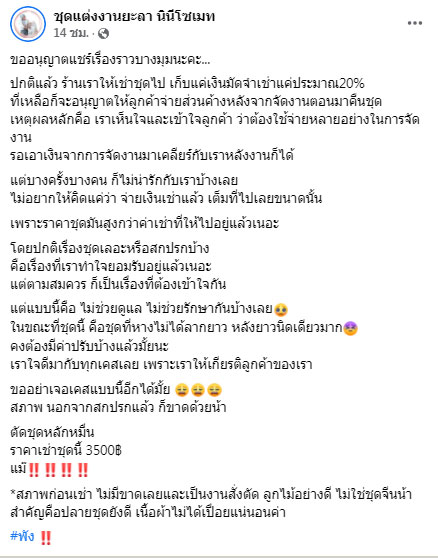 โดยข้อความระบุว่า “ขออนุญาตแชร์เรื่องราวบางมุมนะคะ ปกติแล้ว ร้านเราให้เช่าชุดไป เก็บแค่เงินมัดจำเช่าแค่ประมาณ 20 % ที่เหลือก็จะอนุญาตให้ลูกค้าจ่ายส่วนค้างหลังจากจัดงานตอนมาคืนชุด เหตุผลหลักคือ เราเห็นใจและเข้าใจลูกค้า ว่าต้องใช้จ่ายหลายอย่างในการจัดงาน รอเอาเงินจากการจัดงานมาเคลียร์กับเราหลังงานก็ได้