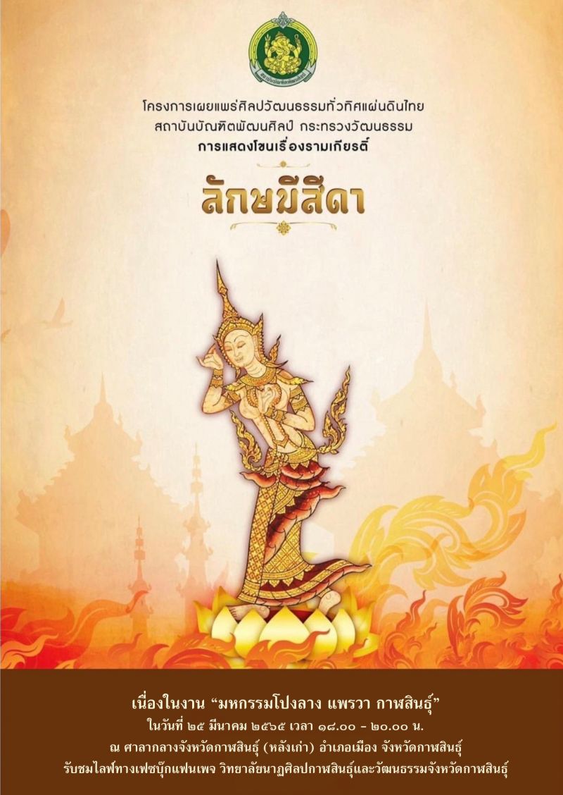 โครงการเผยแพร่ศิลปวัฒนธรรมทั่วทิศแผ่นดินไทย กระทรวงวัฒนธรรมโดยสถาบันบัณฑิตพัฒนศิลป์ เชิญชวนประชาชนร่วมสืบสานงานประเพณี พร้อมชื่นชมความตระการตาของนาฏกรรมชั้นสูงของไทย กับ การแสดงโขนเรื่องรามเกียรติ์ ชุด ลักษมีสีดา โดยนักแสดงจากวิทยาลัยนาฏศิลปกาฬสินธุ์ ในงาน “มหกรรมโปงลาง แพรวา กาฬสินธุ์” งานประเพณีท้องถิ่นของจังหวัดที่จัดเป็นประจำทุกปี ซึ่งจัดขึ้นระหว่างระหว่างวันที่ 18-27 มีนาคม 2565 ณ ศาลากลางจังหวัดกาฬสินธุ์ (หลังเก่า) อำเภอเมือง จังหวัดกาฬสินธุ์ โดยการแสดงโขนจะจัดขึ้นในวันศุกร์ที่ 25 มีนาคมศกนี้ เวลา 18.00 – 20.00 น. และสามารถรับชมได้ทางเฟซบุ๊กแฟนเพจ วิทยาลัยนาฏศิลปกาฬสินธุ์และวัฒนธรรมจังหวัดกาฬสินธุ์