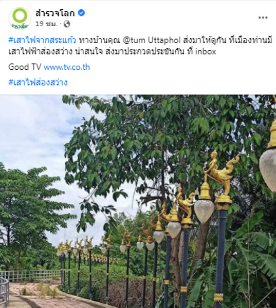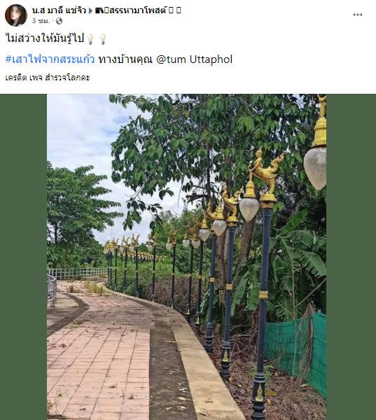 ทั้งนี้ เพจดังกล่าวได้มีการแชร์ออกไป พร้อมข้อความ อาทิ ถี่ไปมั้ยครับเนี่ย , #เสาไฟจากสระแก้ว ทางบ้านคุณ @tum Uttaphol ส่งมาให้ดูกัน ที่เมืองท่านมีเสาไฟฟ้าส่องสว่าง น่าสนใจ ส่งมาประกวดประขันกัน ที่ inbox , ไม่สว่างให้มันรู้ไป #เสาไฟจากสระแก้ว ทางบ้านคุณ เป็นต้น. -008