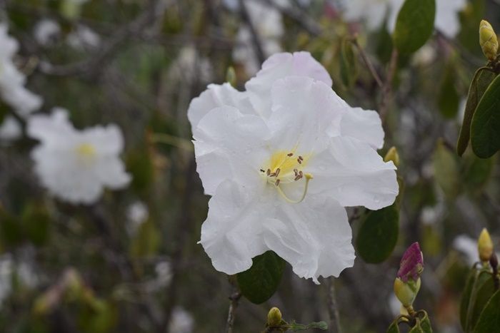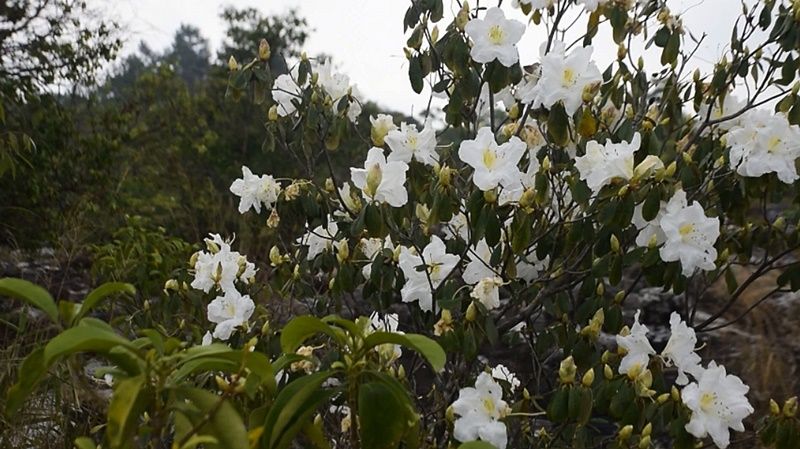 สำหรับดอกกุหลาบขาว บนอุทยานแห่งชาติภูหินร่องกล้า มีชื่อเรียกตามภาษาท้องถิ่นว่า ดอกสามี เป็นไม้พุ่ม ไม่ผลัดใบ มีความสูงประมาณ 1-3 เมตร กิ่งก้านจะแตกช่อเป็นพุ่มขนาดใหญ่ ดอกออกเป็นช่อตามปลายกิ่ง ช่อละ 3-5 ดอก ดอกจะมีสีขาวล้วน และขาวอมชมพู มีสีเหลืองแต้มตรงโคนดอก กลีบดอกเชื่อมติดกันเป็นรูปกรวย หรือระฆัง ส่วนใหญ่ สามารถพบตามภูเขาที่มีระดับความสูง 1,000-1,600 เมตร ขอบขึ้นเป็นกลุ่มหรือกระจายตามที่โล่งแจ้งที่มีพื้นที่เป็นหินทราย ในประเทศไทยพบที่อุทยานแห่งชาติภูกระดึง เขตรักษาพันธุ์สัตว์ป่าภูหลวง และมากที่สุดที่อุทยานแห่งชาติภูหินร่องกล้า – 003