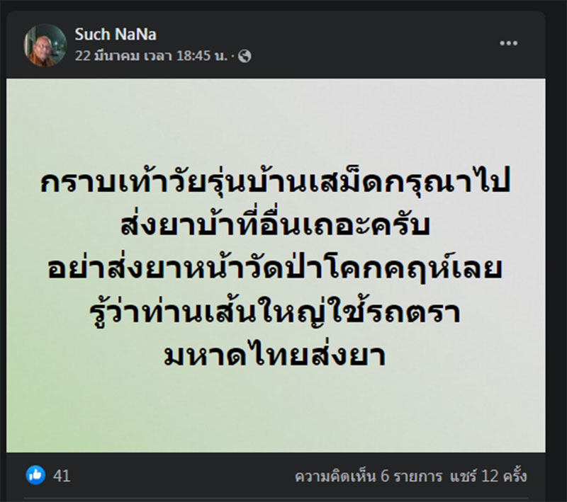 25 มีนาคม 2565 ผู้สื่อข่าวรายงานว่า ได้มีผู้ใช้เฟสบุ๊กชื่อว่า Such NaNa โพสต์ข้อความว่า “กราบเท้าวัยรุ่นบ้านเสม็ด ไปส่งยาบ้าที่อื่นเถอะ อย่าส่งยาหน้าวัดโคกคฤห์ เลย รู้ว่าท่านเส้นใหญ่ใช้รถตรามหาดไทยส่งยา” ก็สร้างความฮือฮาในโลกโซเชียล