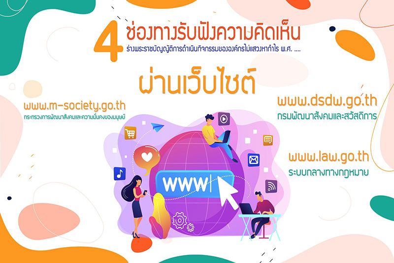 1) ผ่านเว็บไซต์ กระทรวงการพัฒนาสังคมและความมั่นคงของมนุษย์ที่ www.m-society.go.th เว็บไซต์และเว็บบอร์ดของกรมพัฒนาสังคมและสวัสดิการ www.dsdw.go.th และระบบกลางทางกฎหมาย https://www.law.go.th