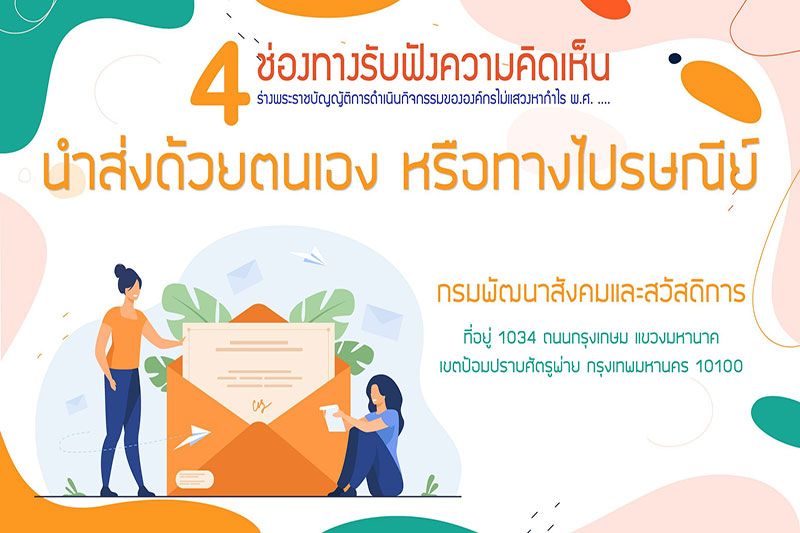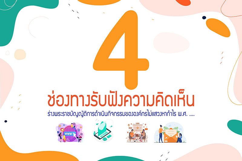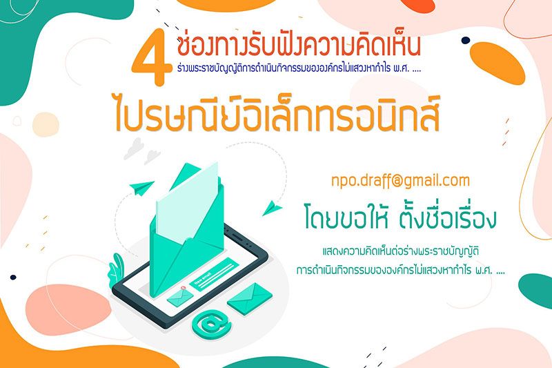 3) ทางไปรษณีย์อิเล็กทรอนิกส์ (E-mail) :npo.draff@gmail.comโดยขอให้ ตั้งชื่อเรื่อง “แสดงความคิดเห็นต่อร่างพระราชบัญญัติการดำเนินกิจกรรมขององค์กรไม่แสวงหากำไร พ.ศ. ….”