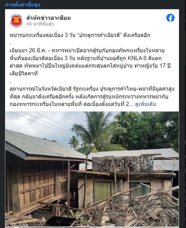 วันนี้ (26 มี.ค.65) เพจ “สำนักข่าวอาเซียน” ได้มีการโพสต์เนื้อหาข่าวเกี่ยวกับสถานการณ์สู้รบระหว่างทหารพม่ากับกองทัพกะเหรี่ยงในหลายพื้นที่ของเมียวดีต่อเนื่อง 3 วัน โดยมีเนื้อหาดังนี้