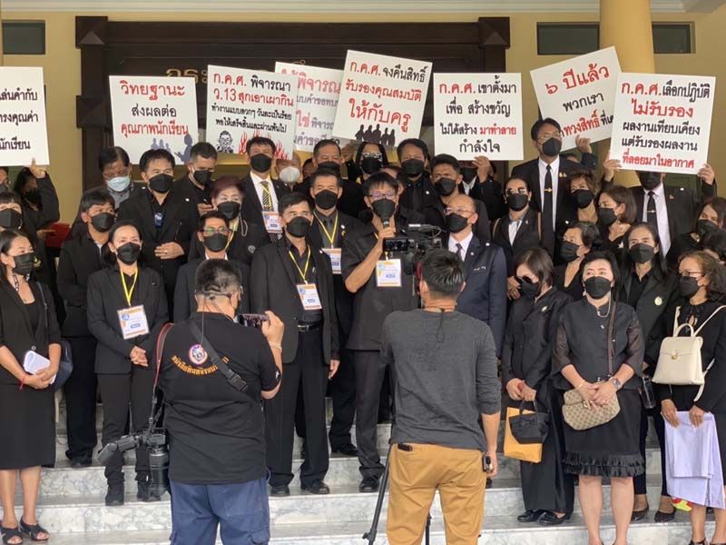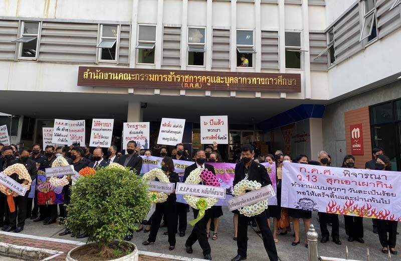 วันที่ 28 มีนาคม 2565 ที่กระทรวงศึกษาธิการ (ศธ.) เครือข่ายพัฒนาคุณภาพผู้ได้รับผลกระทบจากการขอมีและเลื่อนวิทยฐานะตามเกณฑ์ ว13 เรื่อง การให้ข้าราชการครูและบุคลากรทางการศึกษาผู้มีผลงานดีเด่นที่ประสบผลสำเร็จเป็นที่ประจักษ์ มีวิทยฐานะ หรือเลื่อนเป็นวิทยฐานะชำนาญการพิเศษ และวิทยฐานะเชี่ยวชาญ กว่า 50 คน แต่งชุดดำ ถือป้ายข้อความ พร้อมพวงหรีด