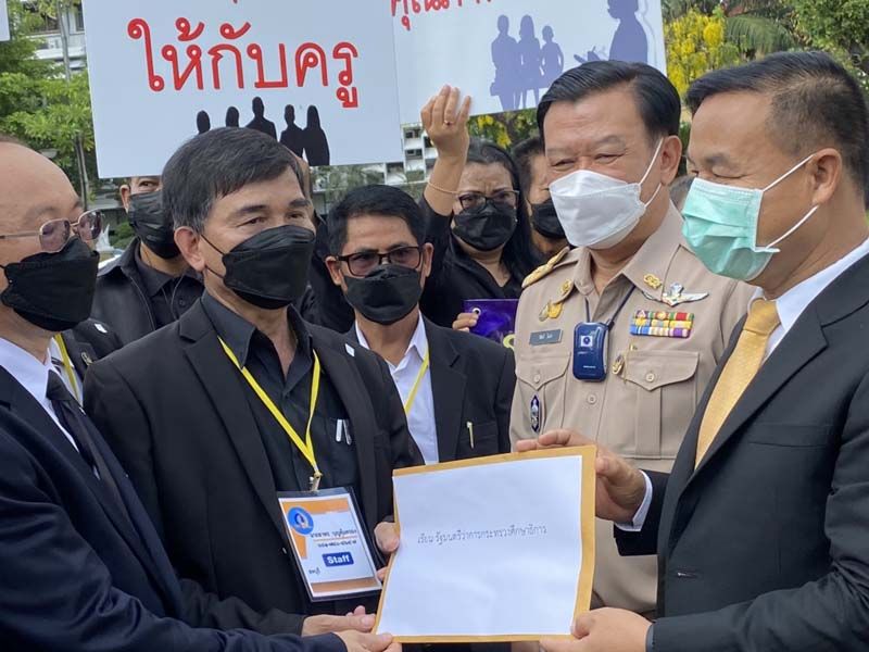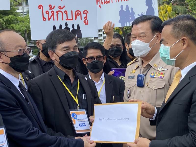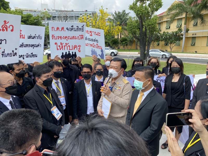 โดยมี นายวิสิทธิ ใจเถิง หัวหน้าสำนักงานรัฐมนตรี กระทรวงศึกษาธิการ และนายปราโมทย์ แสนกล้า รองเลขาธิการ ก.ค.ศ. ร่วมรับหนังสือร้องเรียนและแถลงการณ์ แทน