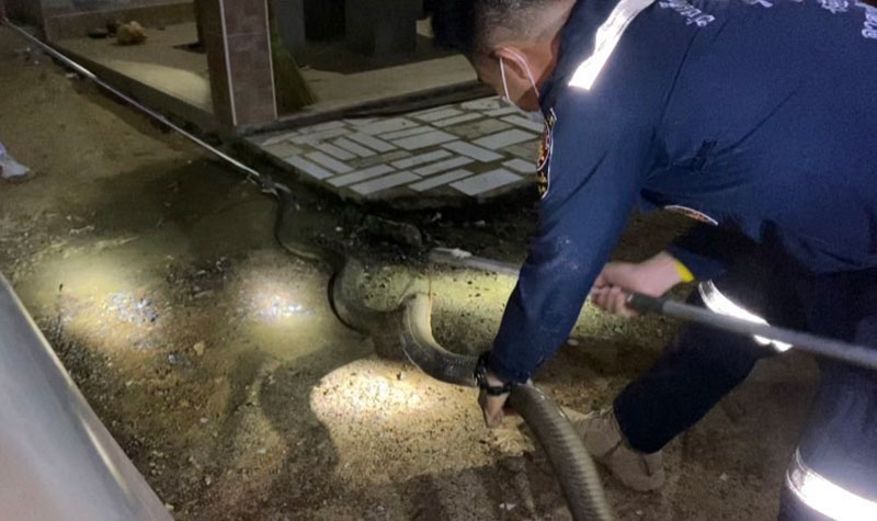 ชาวบ้านและกู้ภัยช่วยกันนำไม้แหย่เข้าไปหวังให้งูขยับตัวเพื่อจะดูว่าหัวงูหันไปทางไหน แต่ยิ่งแหย่งูก็ยิ่งเลื้อยหนีลึกเข้าไป ทำให้ภารกิจการจับงูจงอางในครั้งนี้ เป็นไปด้วยความยากลำบาก เนื่องจากจุดที่งูจงอางเข้าไปซุกอยู่ เป็นจุดที่ลึกและมีช่องที่แคบ ต้องสตาร์ทรถขับออกมาจากโรงรถเพื่อได้มีพื้นที่กว้างขึ้น เวลาผ่านไปประมาน 1 ชั่วโมง จังหวะที่กู้ภัยก้มลงไปหาดูใต้ท้องรถ จู่ๆงูจงอางก็เลื้อยพุ่งออกมาอย่างรวดเร็ว ทำเอาทั้งชาวบ้านและกู้ภัยตกใจจนต้องถอยหนี ก่อนจะวิ่งไล่จับท่ามกลางความตกใจของชาวบ้าน แต่ก็สามารถควบคุมตัวไว้ได้