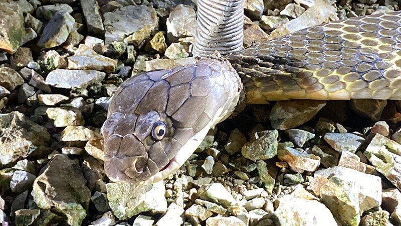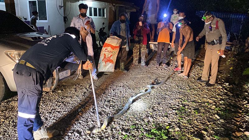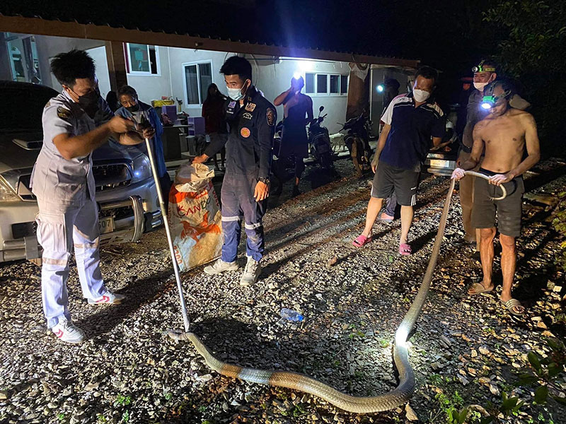 28 มีนาคม 2565 เจ้าหน้าที่กู้ภัยจังหวัดพัทลุง เข้าตรวจสอบรถยนต์กระบะ ยี่ห้อโตโยต้า วีโก สีบอร์นทอง ทะเบียน บธ 1507 พัทลุง ซึ่งจอดอยู่ในโรงจอดรถ ข้างบ้านเลขที่ 262 หมู่ที่ 5 ตำบลตะแพน อำเภอศรีบรรพต จังหวัดพัทลุง หลังได้รับแจ้งว่า มีงูจงอางตัวใหญ่ ยาวประมาณ 4 เมตร เลื้อยหนีเข้าไปซ่อนตัวอยู่ใต้ท้องรถ เจ้าหน้าที่กู้ภัยใช้ไฟส่องดูเห็นเพียงส่วนลำตัว ที่นอนขดแอบอยู่ ไม่เห็นส่วนหัว