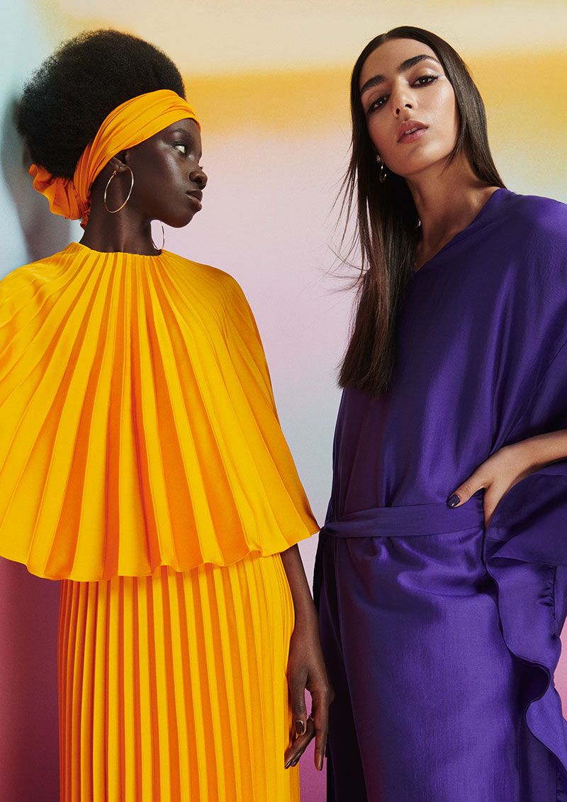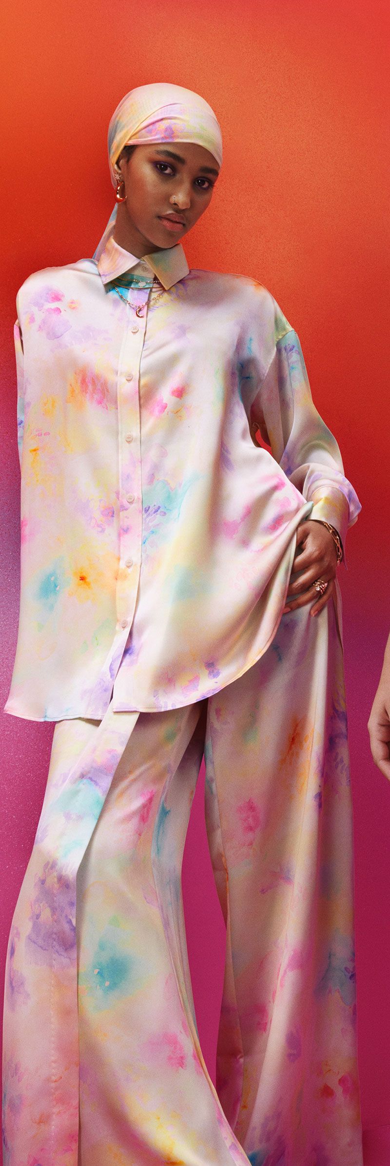ส่วนรองเท้าสลิปออนส้นหนาสีส้ม สร้อยคอสีทองสไตล์เลเยอร์ และเข็มขัดโซ่ต่างช่วยเติมเต็มลุคในแบบเฉพาะตัว รวมถึงช่วยเพิ่มสีสันและเน้นการตกแต่งให้กับผ้าแจ็คการ์ดลายสีน้ำ ลายพิมพ์ และเท็กซ์เจอร์ที่ดูพลิ้วไหว โดยคอลเลคชั่นนี้ทำจากเส้นใยและวัสดุยั่งยืนเป็นส่วนใหญ่ เช่น วิสโคสที่ยั่งยืน (ECOVERO) ผ้าโพลีเอสเตอร์รีไซเคิลผ้าเทนเซลและผ้าฝ้ายออร์แกนิก